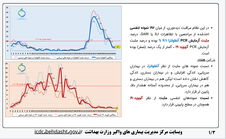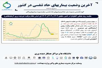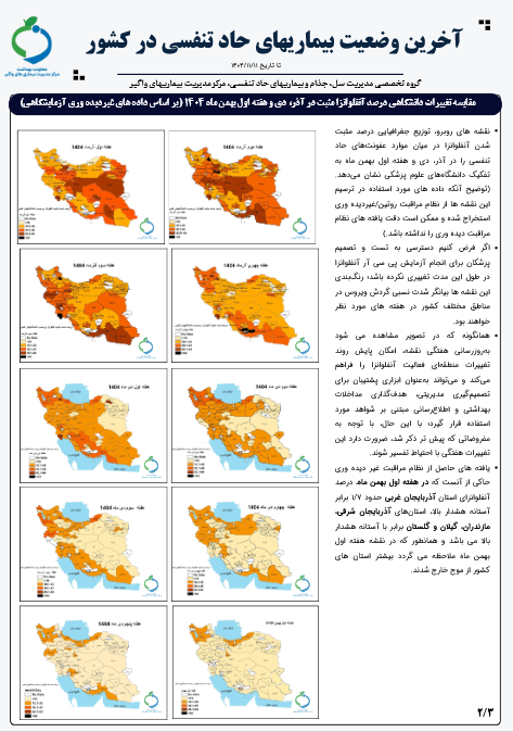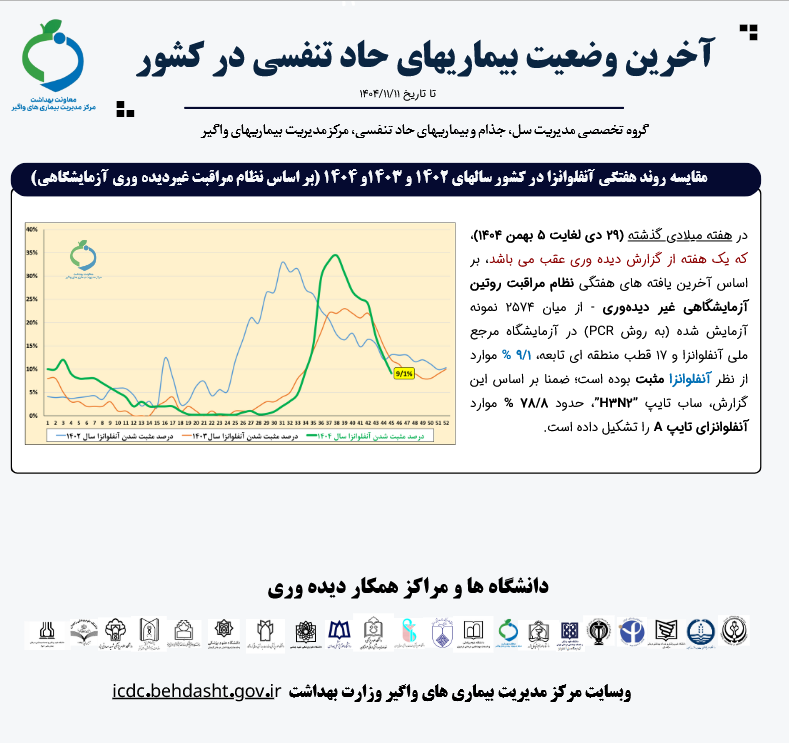 آخرین وضعیت بیماریهای حاد تنفسی در کشور تا 11 بهمن 1404 1404/11/19 - 12:57 - تعداد بازدید: 8 - تعداد بازدیدکننده: 8 - کد خبر : 24427 - گروه خبری : آخرین اخبار,گالری عکس - تعداد نظرات : 0 آخرین وضعیت بیماریهای حاد تنفسی در کشور گزاره برگ بیماریهای حاد تنفسی تا 11 بهمن 1404