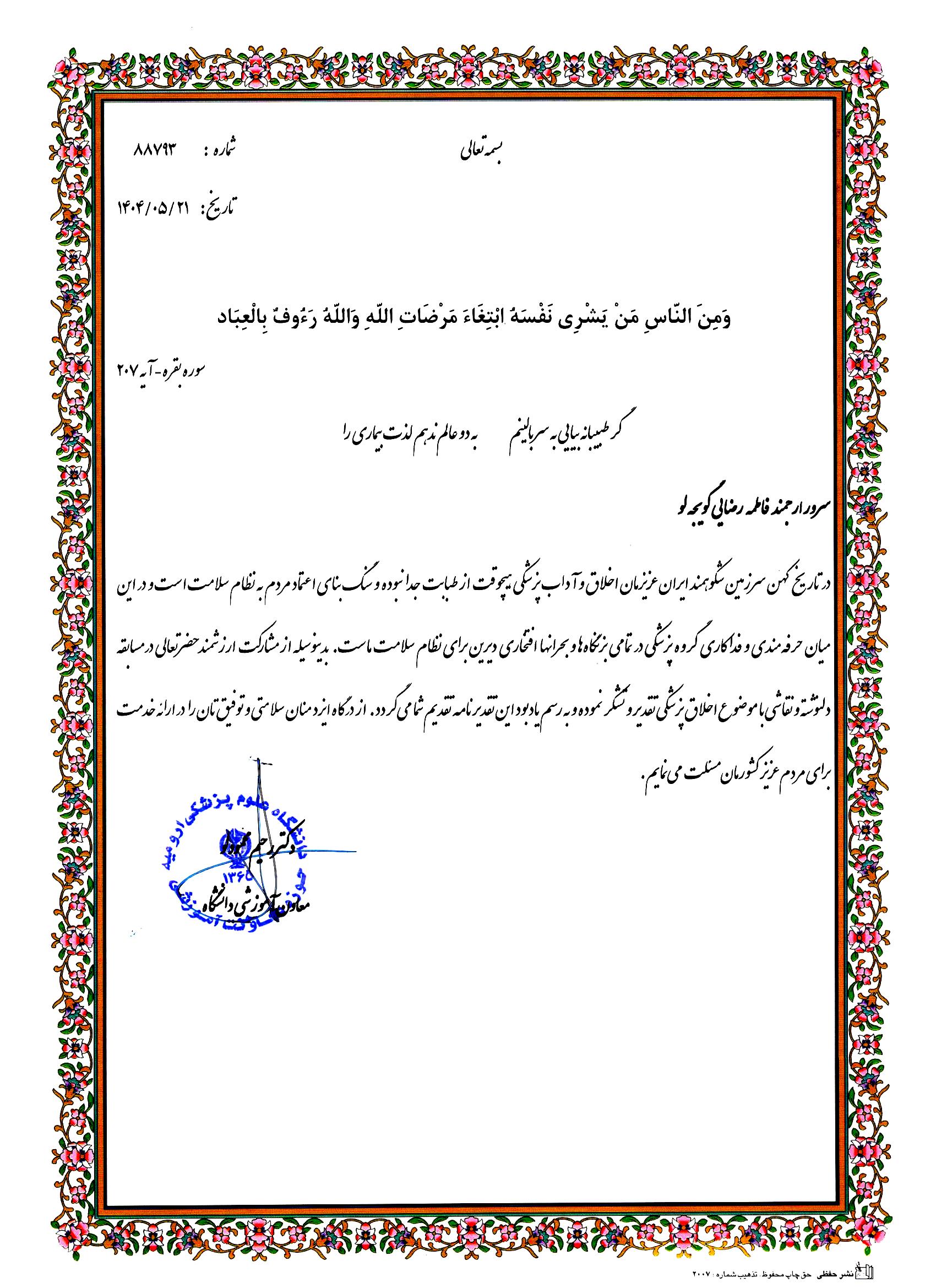 ایشان در مسابقه «دلنوشته و نقاشی با موضوع اخلاق پزشکی» که به همت معاونت آموزشی برگزار شد، با ارائه اثری خلاقانه و تأثیرگذار، نظر داوران را جلب کرده و در جمع برگزیدگان این رویداد قرار گرفت. این مسابقه با هدف ترویج اخلاق حرفه‌ای، تقویت مسئولیت‌پذیری و تعمیق نگاه انسانی در ارائه خدمات سلامت برگزار شده بود.