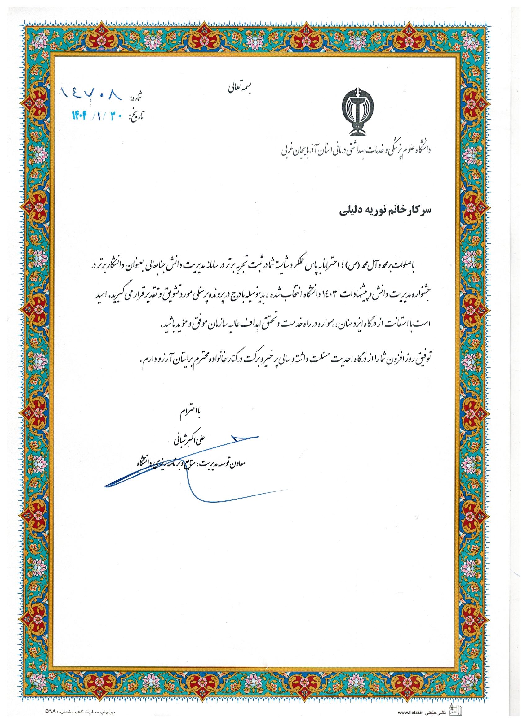 معاونت توسعه مدیریت،منابع و برنامه ریزی دانشگاه باهدف تبادل دانش وتجارب کارکنان و مدیران دانشگاه و انعکاس ایده های خلاقانه و پیشنهاد های کاربردی ، سالانه اقدام به برگزاری جشنواره دانش و نظام پیشنهادات می نماید که دراین راستا نوریه دلیلی و مریم گل میرزایی کارشناسنان گروه پیشگیری و مبارزه با بیماریهای غیرواگیر معاونت معاونت بهداشت دانشگاه در جشنواره مدیریت دانش و پیشنهادات سال1403 دانشگاه علوم پزشکی و خدمات بهداشتی درمانی استان آذربایجان غربی، موفق به کسب عنوان دانشکار برتر شده و مورد تشویق و تقدیر معاون محترم توسعه مدیریت،منابع و برنامه ریزی دانشگاه قرار گرفتند.